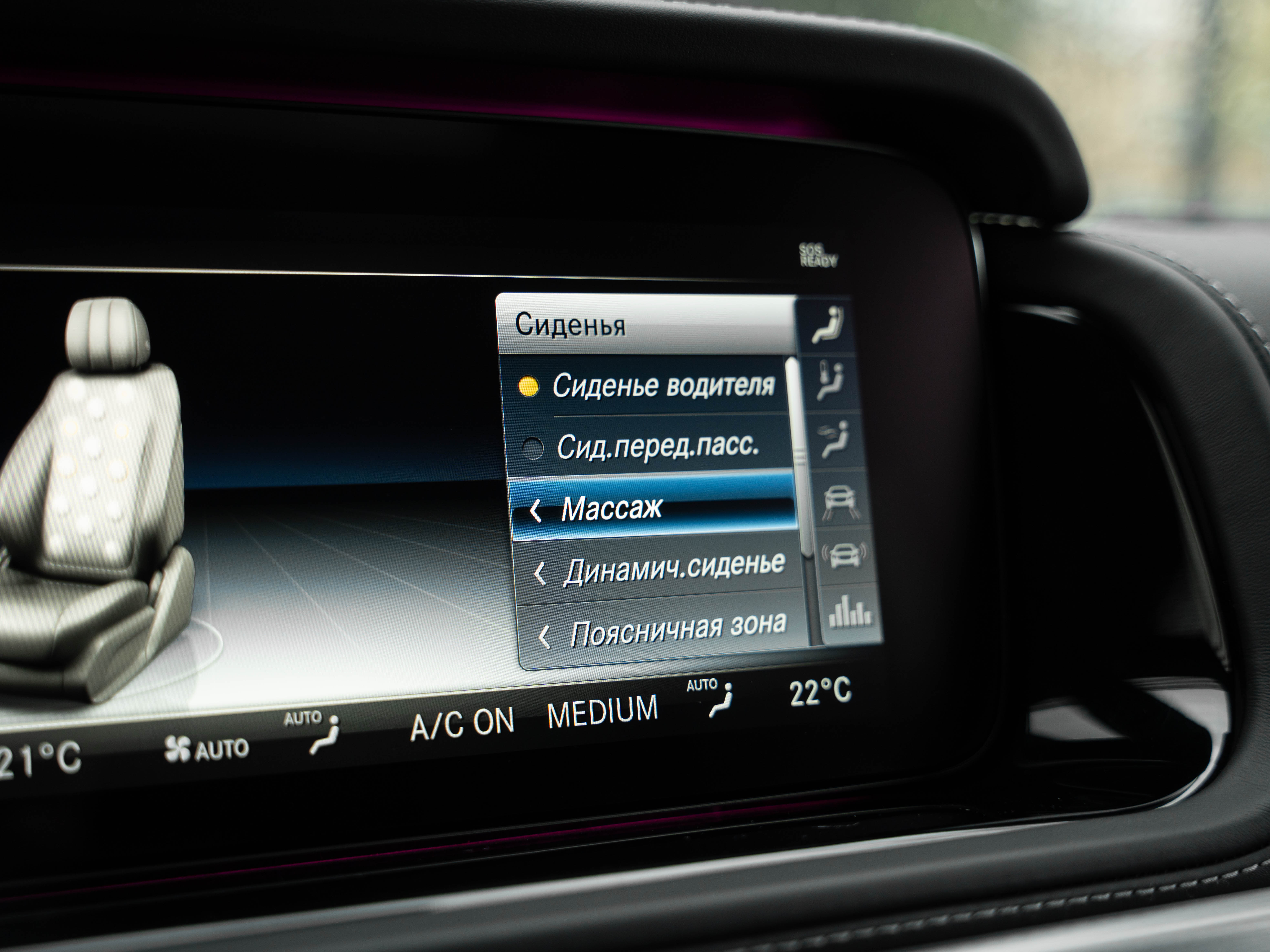 Комплектация: AMG-пакет, оптика Multibeam Led, ромбовидный дизайн интерьера, люк с электроприводом, расширенная отделка салона кожей Nappa, адаптивный круиз-контроль, ассистент удержания в полосе, камеры кругового обзора 360°, передние активные мультиконтурные сиденья с электроприводом и функциями подогрева, вентиляции и памяти, , кованые двухцветные диски AMG R22, контурное освещение салона, декоративные элементы чёрный рояльный лак, мультируль AMG «Dinamica» с комбинированной отделкой из кожи и алькантары с юнитами, акустическая система премиум BURMESTER 3D, двойной стеклопакет, спортивная тормозная система с красными суппортами АМG, тягово-сцепное устройство и многое другое.